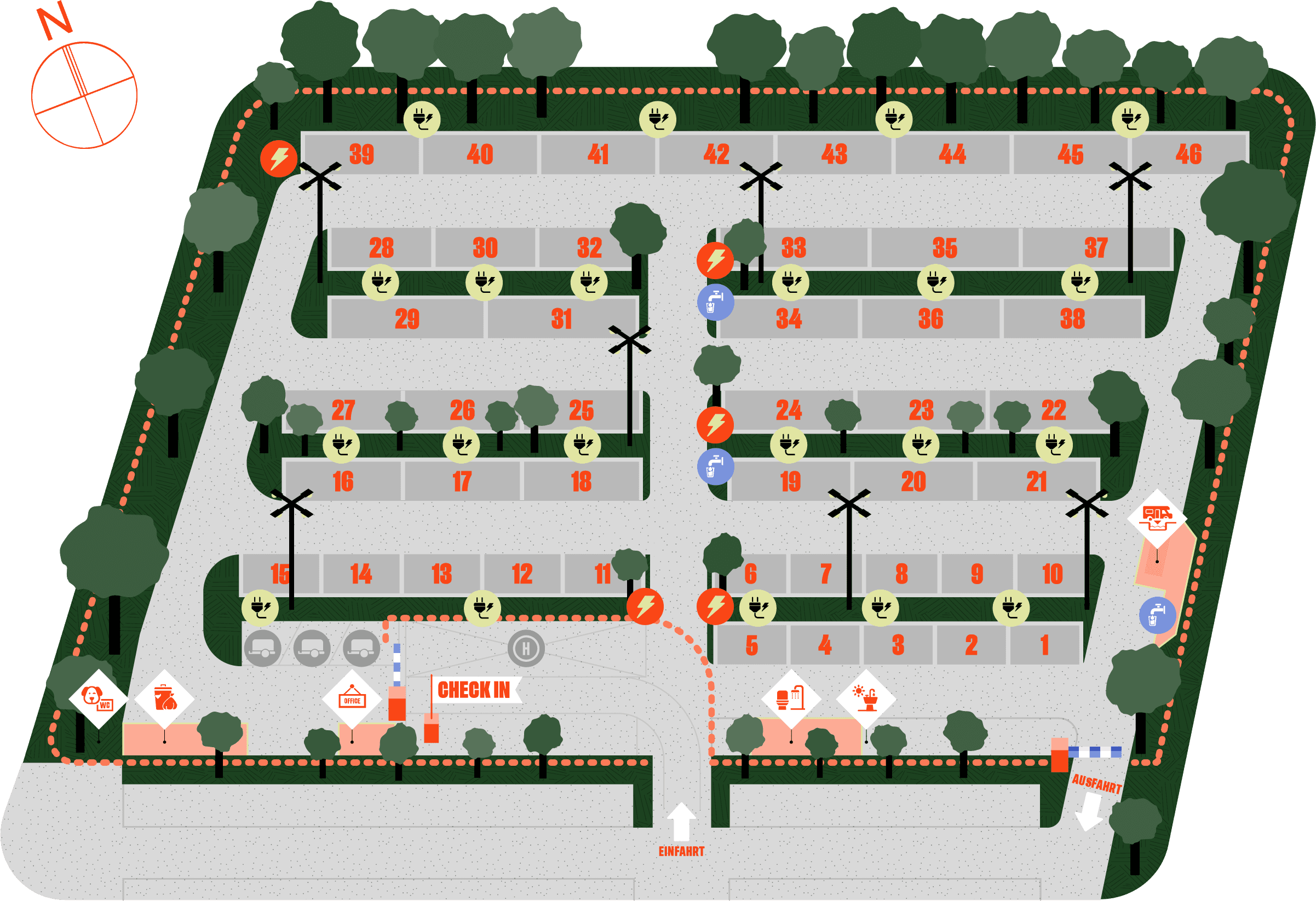 • Stellplatzgröße mind. ca. 11 x 5 Meter – für normale Wohnmobile und Caravans